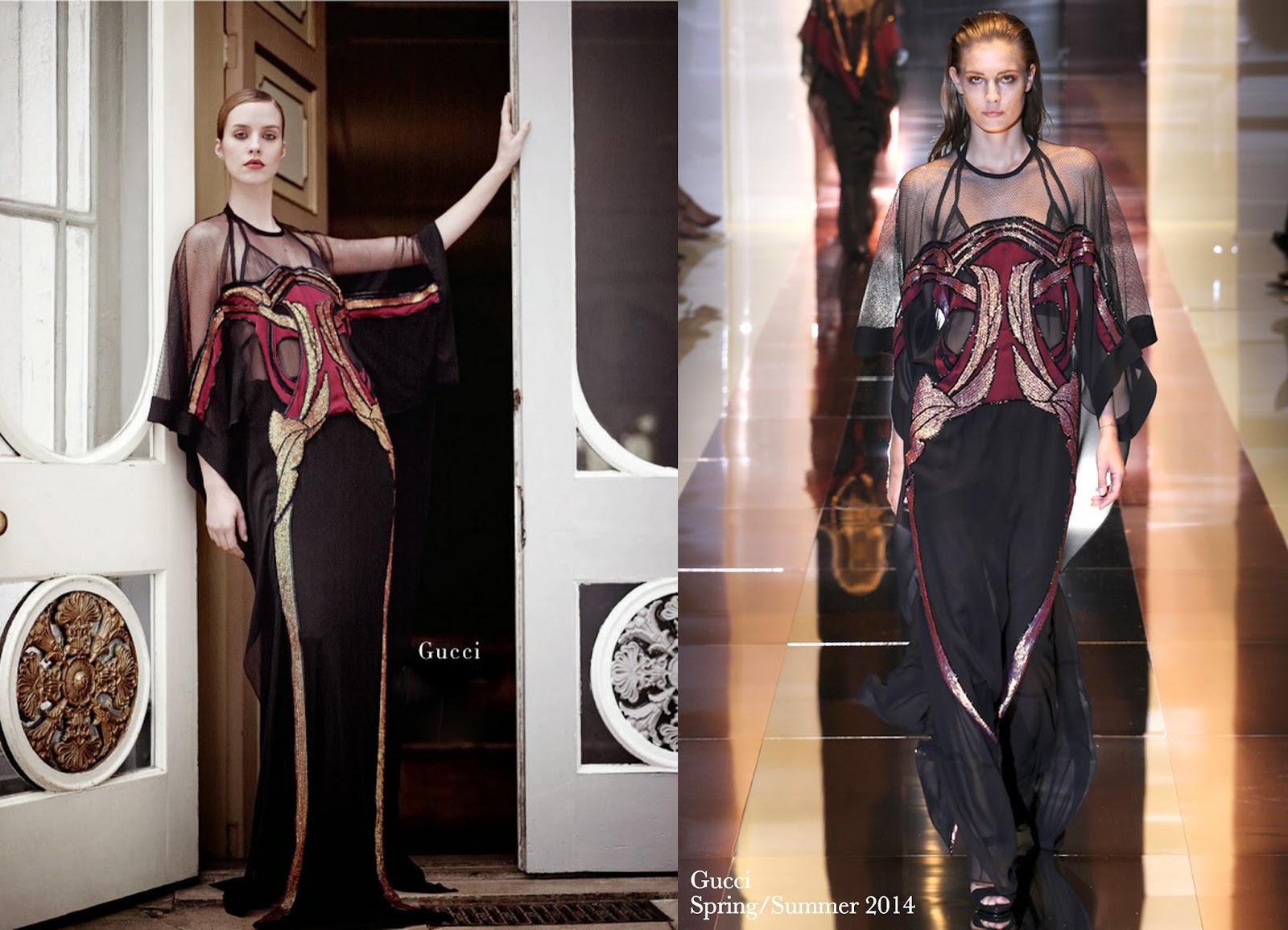 | Gucci conveys their regular brand of modern luxury in this sheer black georgette dress with burgundy and gold interwoven panels, chicly worn with a pair of black trousers. |